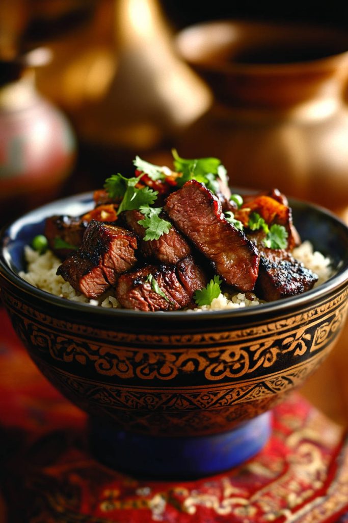 Arroz cubierto por rodajas de carne sazonadas con soya y especias